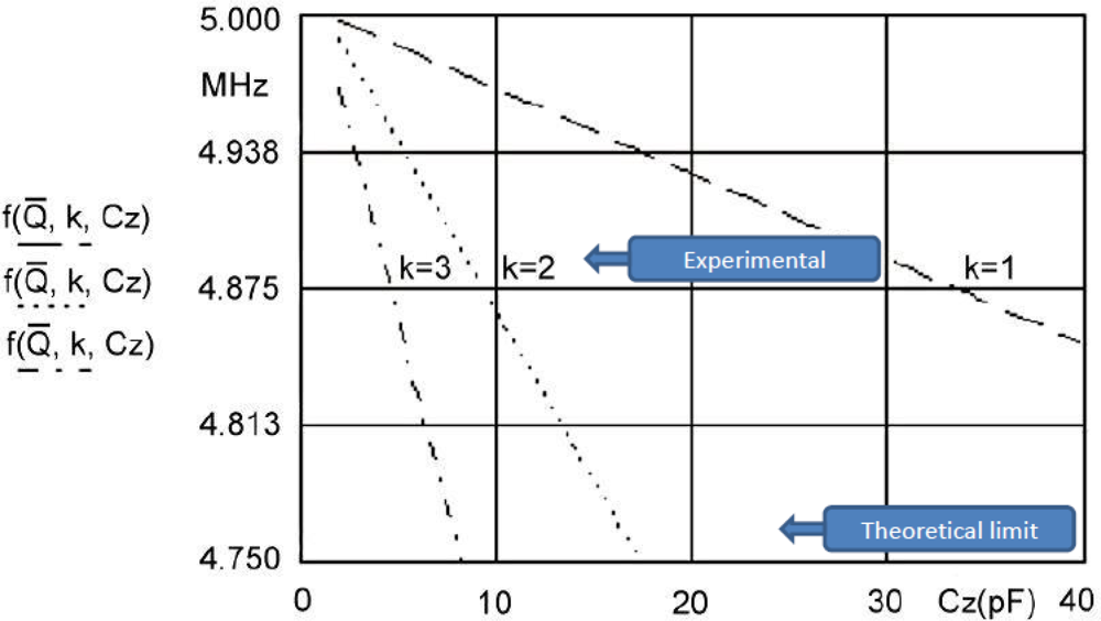 Experimental results show that the use of the switching method excellently compensates AT-cut frequency-temperature characteristics and highly improves second-to-second and minute-to-minute accuracy by ×100 for k = 1, 2, 3, depending on C0 compensation. This high frequency difference accuracy represents a novelty and a major advantage of the switching method discussed in the measurement of ato and femto ranges. With fine tuning of a series load compensation inductance Lcom connected in series with the crystal, the frequency of the oscillator is set to an appropriate output circuit frequency. It should also be emphasized that the exact pulling limits depend on the crystal’s Q value as well as the associated stray capacitances and the factor k. The inductance Lcom is determined from known stray capacitances and the known factor k.
