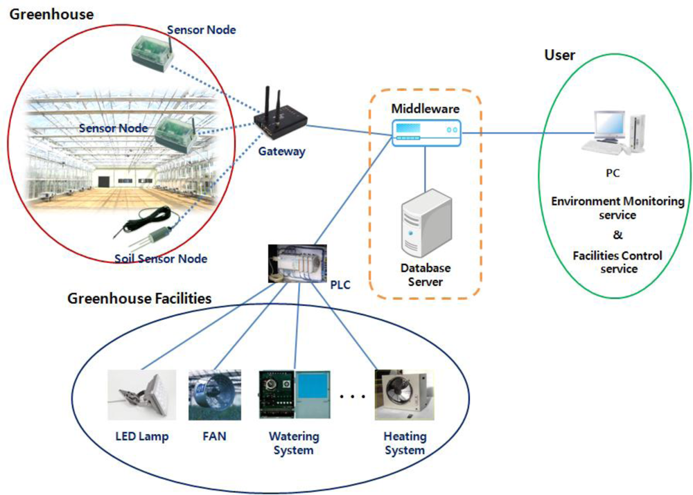 In greenhouses using WSN technologies, soil sensor and environmental sensor nodes are installed inside/outside the greenhouse in order to collect environmental information for monitoring the greenhouse crop growth, and these sensor nodes constitute a wireless sensor network to collect environmental and soil information in the greenhouse.