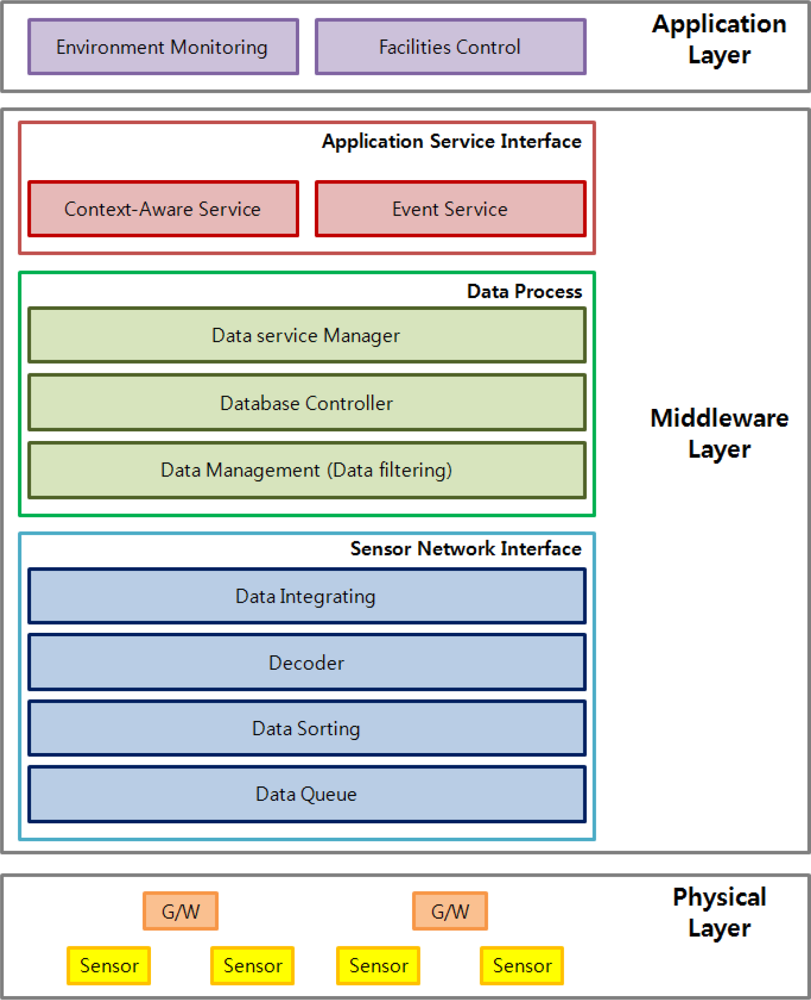 The context aware middleware for u-Greenhouses is composed of a sensor network interface layer, data process layer, and application service layer, and Figure 10 shows an hierarchical diagram of the proposed middleware.