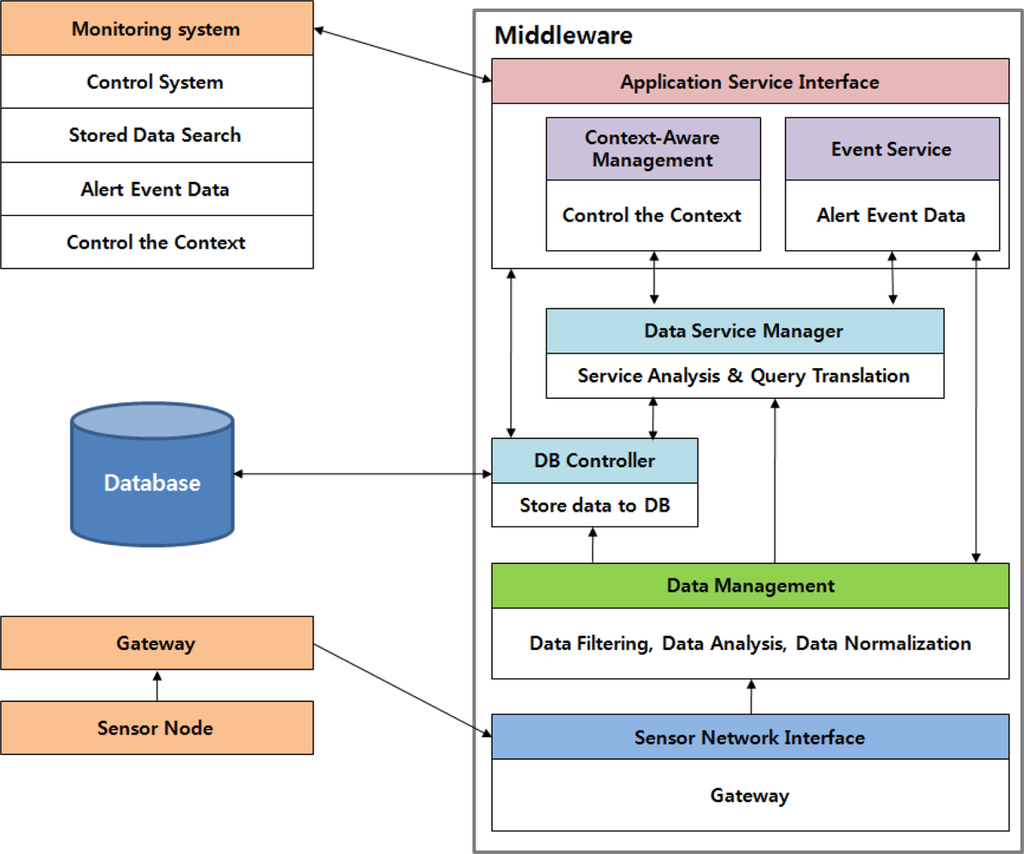 Figure 11 represents the structure and data flow chart of the proposed middleware. Figure 11 shows functions for each module of the middleware and a structural flow with the sensors, gateway, and monitoring system.