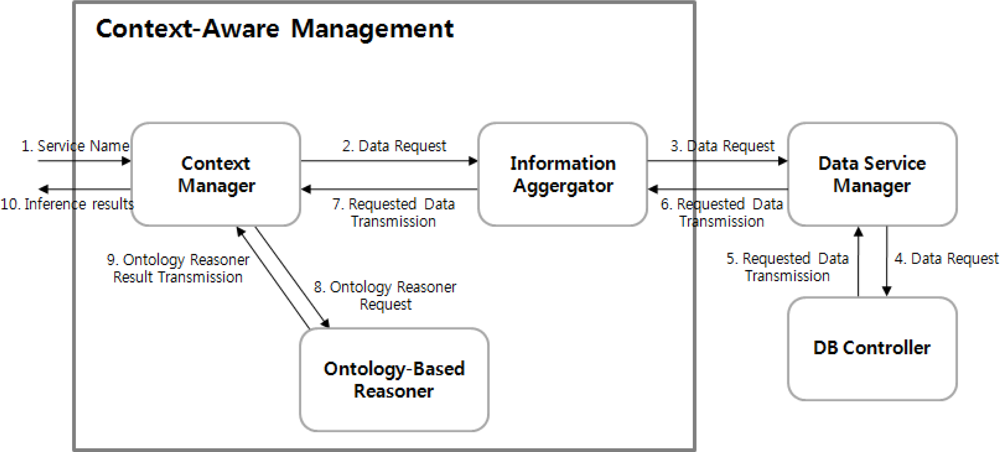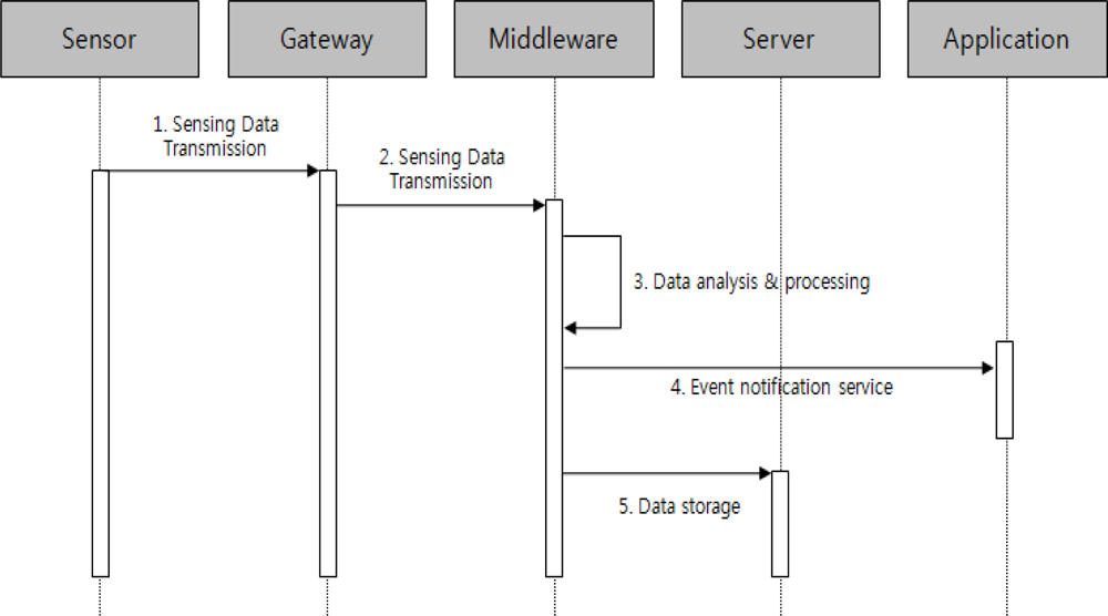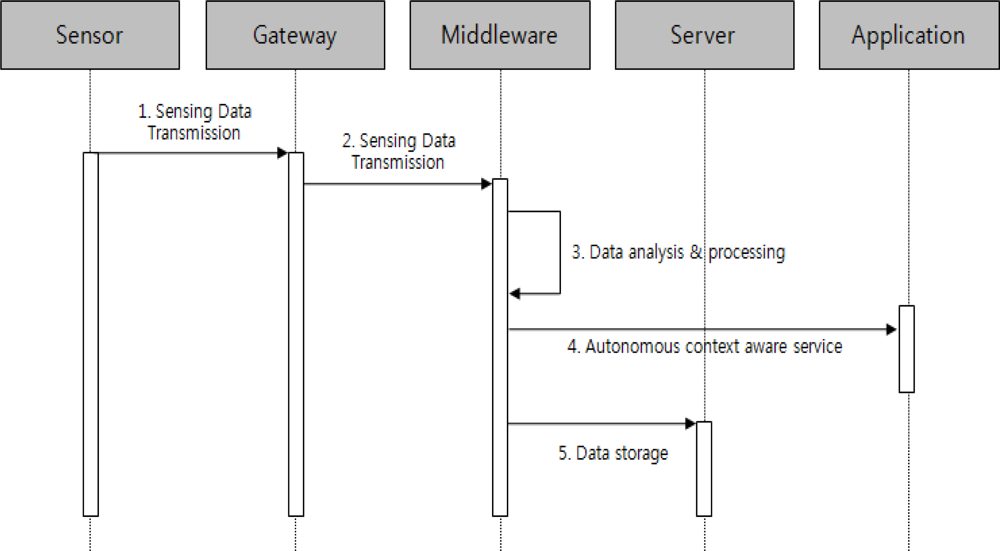 Figure 7 shows the process whereby the context aware service is carried out. If sensor data is entered from sensors, this data is sent to the middleware to perform the analysis and filtering process, and the autonomous context aware service is performed if it corresponds to a configured value of the context aware service.