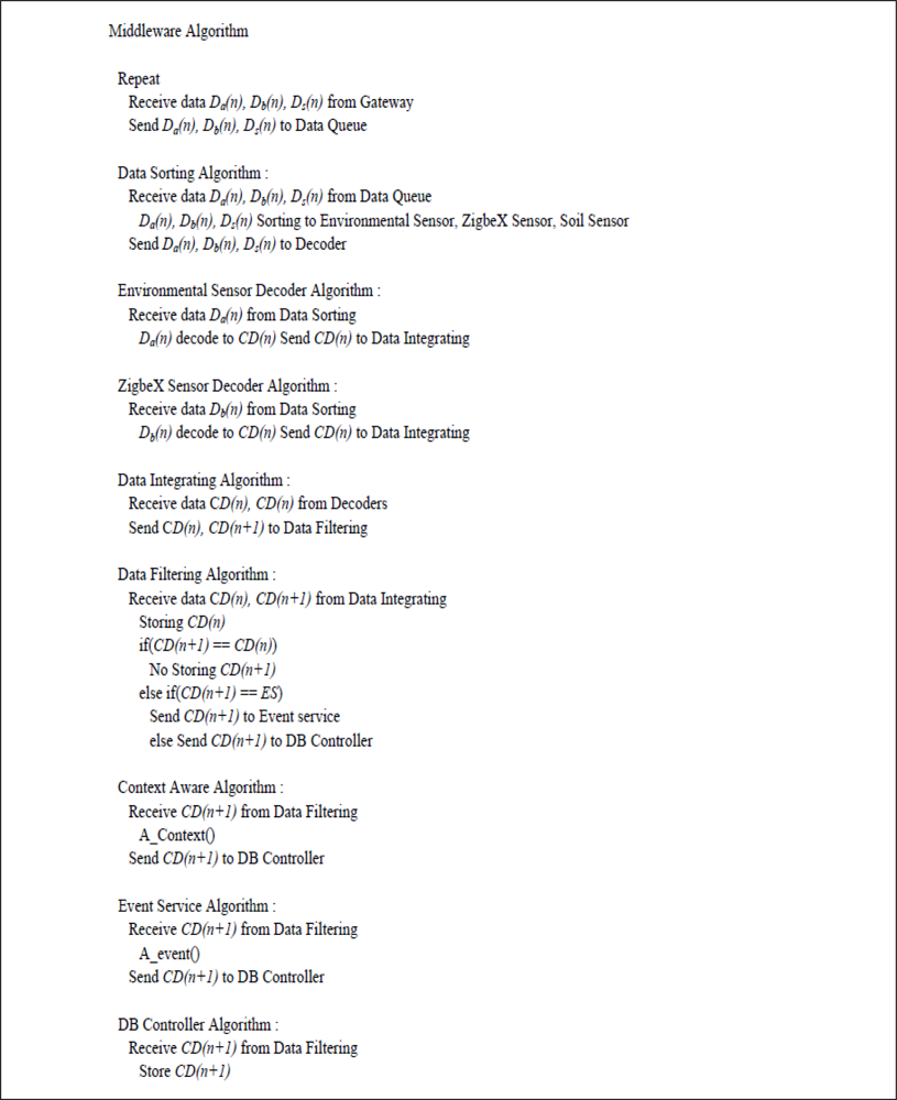 Figure 13 is the algorithm that processes data which is delivered from the gateway in the implemented middleware, to store it in the DB.