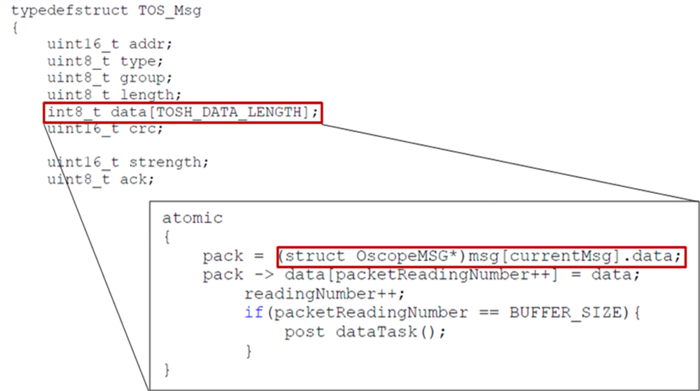 Figure 14 shows the structure of the message (TOS_Msg msg[],) which sends data defined already for abstraction converting into the common form, and data structure int8_t data[TOSH_DATA_LENGTH] containing the corresponding data.