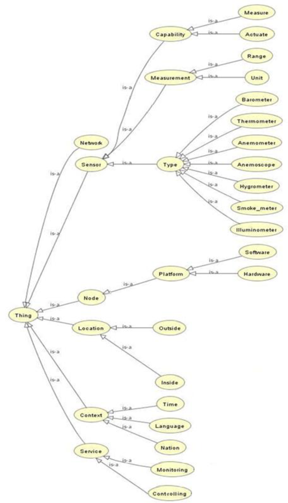 To provide context-aware service, an ontology is constructed as shown in Figure 15; the ontology design uses Protege [33]. The ontology of this paper has six higher classes. Network represents information of sensor networks, and Sensor, Node, Location, and Context represent sensor, node, location, and context information, respectively, and Service represents services that users could be provided in the u-Greenhouse. Such information is written as OWL [34] documents and used with JENA [35].