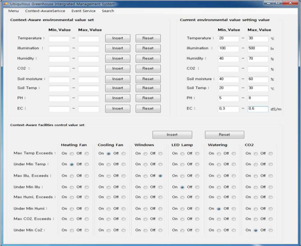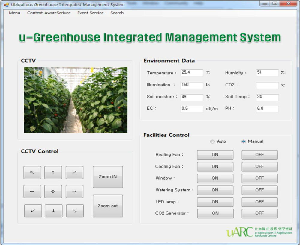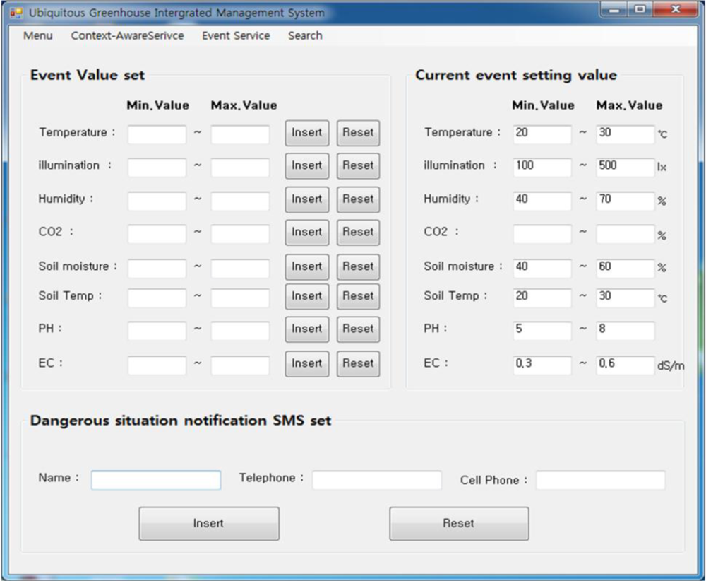 The proposed middleware in this paper was applied to an existing u-Greenhouse to implement the u-Greenhouse integrated management system. Figure 16 shows the UI of u-Greenhouse integrated management system applying the proposed middleware. The system UI displays information such as illuminance, temperature, humidity, CO2, etc. collected from the environmental and soil sensors installed in the greenhouse as a text form, enabling real-time image information of the greenhouse and also controlling the CCTV, and allowing notification of the working state of the greenhouse environmental control facilities and their control. In addition, it was implemented so as to allow managers to directly set a range of context-aware and event services so that it could provide context-aware serviced such as automatic control of the greenhouse environment, etc. and the SMS notification service for dangerous situations.