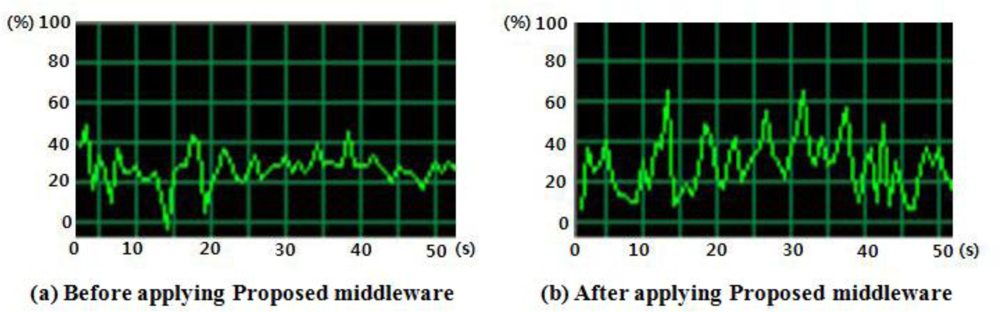 This paper confirmed the proposed middleware’s operability by measuring the server’s load level and the response time for user's queries. To indirectly compare and measure the load level when integrating and processing data generated from lots of sensors, we used an application offered by Microsoft Windows. It is shown that CPU usage was about 20∼30% on average when processing sensing data without middleware, and about 30∼40% on average when processing data with the proposed middleware, as seen in Figure 19. Even though the value using the middleware is a little higher than the existing method processing data without middleware, it does not exceed 50% on average and considering that context-aware service, which it is not provided in the existing system, is added, therefore it could be confirmed that it is useful in terms of system usability.
