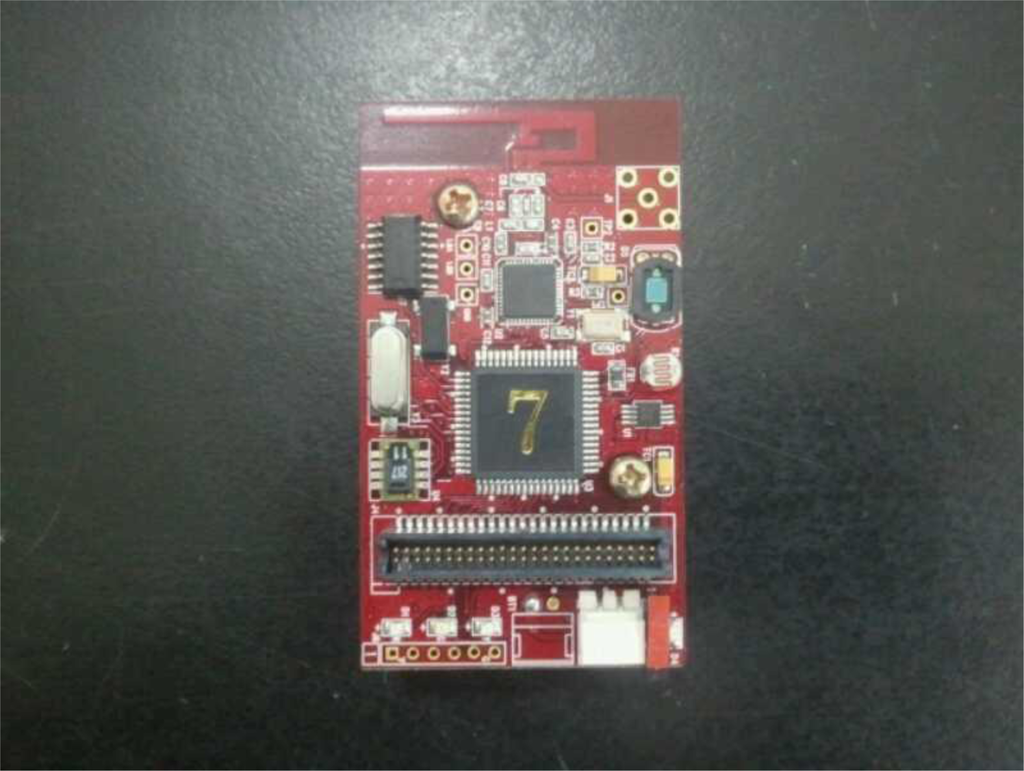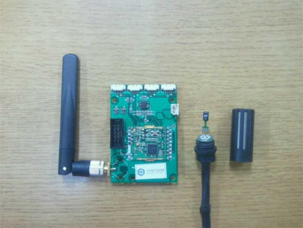 Figure 3 is a developed sensor node, which plays the role of receiving sensor data from the temperature/humidity sensor, processing data in the MSP430 MCU to send it to a relay node and a gateway via a CC2420 RF chip. In addition, the node is separated from the sensor in order to reduce the effects of any heat generated by the node on the sensor [29].