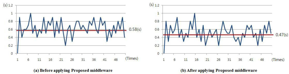 As seen in the figure, the response speed for user’s requests was 0.58 s on average before using the middleware, and after applying the proposed middleware the average response speed was 0.47 s, therefore, it could be seen that there was an improvement in terms of response speed.