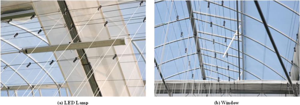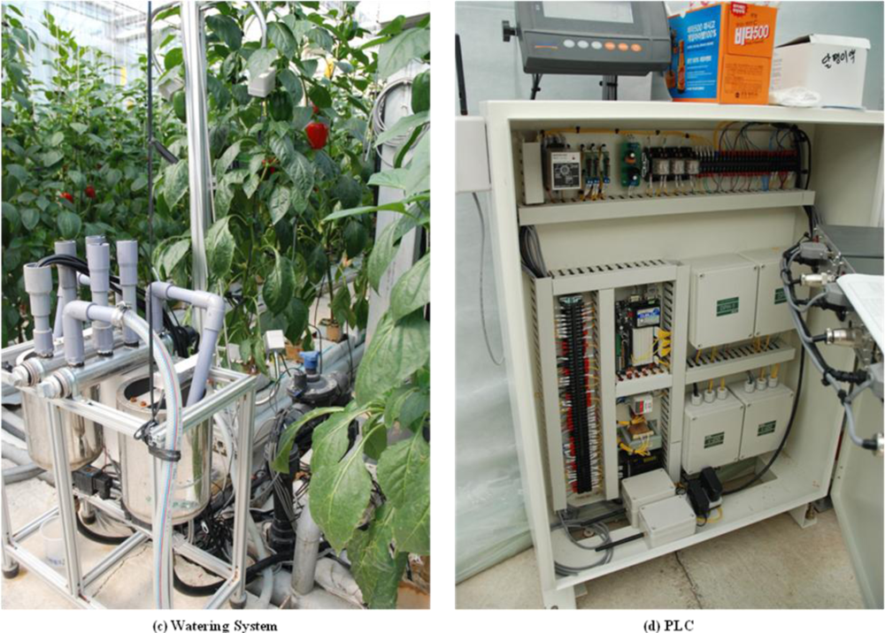 To control greenhouse environment parameters influencing crop growth such as illuminance, temperature, humidity, CO2, etc. based on information collected from the environmental sensors and the soil sensor mentioned above, environment control facilities such as a ventilation and heating system, heat insulation system for reducing energy, shading curtain system following external brightness, circulating fan system regulating air flow in the facility, temperature control system of hot water/heating water, and artificial light source control system following external brightness and biometric information etc. are constructed in the greenhouse, and each environment control facility is controlled through a PLC. Figure 5 shows the environment control facilities and the PLC installed in the greenhouse.