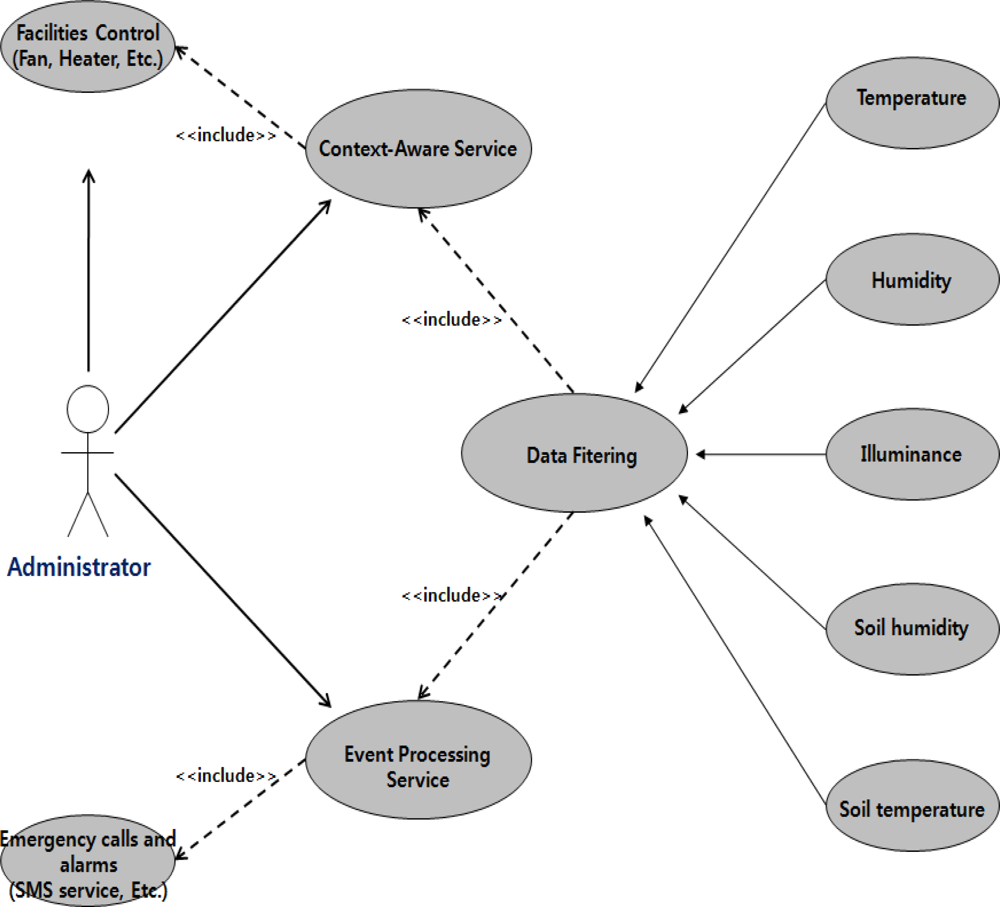 The data filtering function is to avoid storing duplicated data to reduce the server’s load for data sent in real time, and the context aware service is a function that specifies numerical values for certain data and decides contexts intelligently, to autonomically control greenhouse facilities appropriately for an optimum crop growth environment in the greenhouse. The event service prevents unexpected accidents by sending an urgent message to producers or managers if greenhouse environmental data, which is collected from sensors in real time, corresponds to a some configured event value.