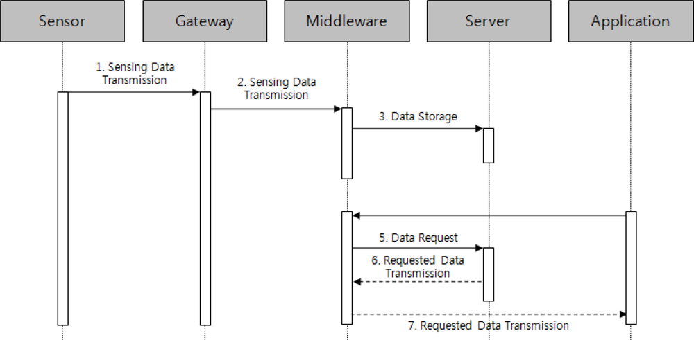 Figure 9 represents a process that requests greenhouse data and image information stored in the database (DB), and the requested data is received. If the application manager accesses the middleware to request greenhouse information, the middleware requests the greenhouse information stored in the DB to be sent, and sends the received information to the application to make the greenhouse information monitoring possible.