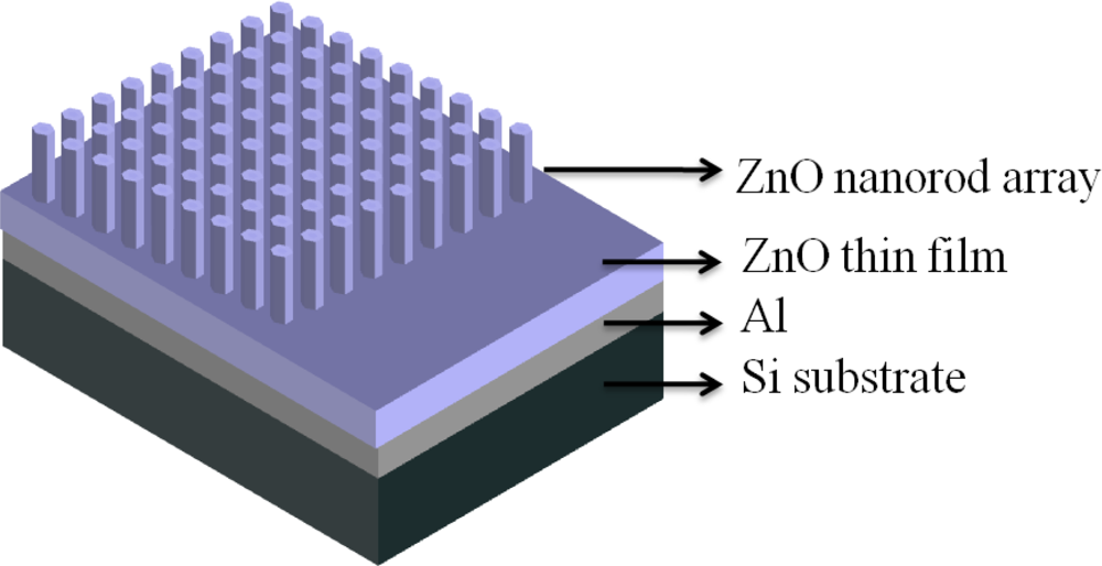 To fabricate the glucose biosensor EGFETs, a 100-nm-thick Al layer was first deposited on a silicon (Si) substrate as the conducing layer. A 200-nm-thick intrinsic ZnO film and an 80-nm-long intrinsic ZnO nanorod array were then deposited on the Al conducting layer using the vapor cooling condensation system. A schematic configuration of the ZnO glucose biosensors is shown in Figure 1.