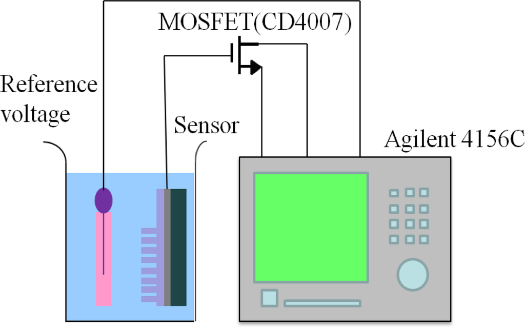 To measure the pH sensing characteristics of the glucose biosensors, the biosensor and a Ag/AgCl reference electrode were dipped into the buffer solution (the pH value varied from 4 to 12) and the Al conducting layer was connected to the gate of the commercial MOSFET device (CD4007). An Agilent 4156C Semiconductor Parameter Analyzer was used to measure the drain-source current of the MOSFET device. The measuring system is shown in Figure 2.