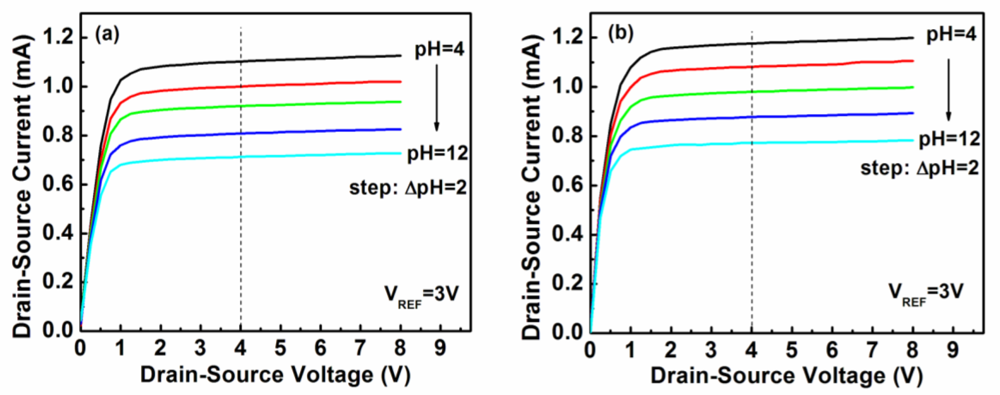 The dependence of the drain-source current (IDS) on the drain-source voltage (VDS) of the glucose biosensors with unpassivated ZnO nanorods and with passivated ZnO nanorods operated at a reference electrode voltage (VREF) of 3 V is shown in Figure 3(a,b), respectively.