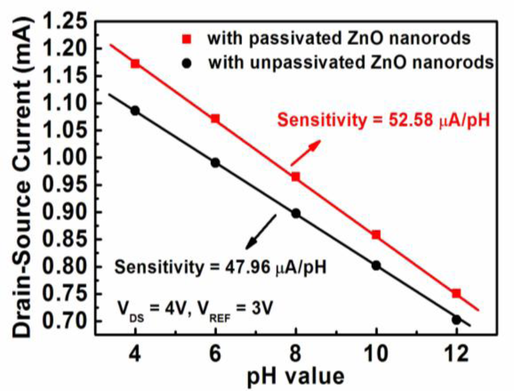 Based on the experimental results shown in Figure 3(a,b), the measured drain-source current as a function of the pH value of the two kinds of biosensors is shown in Figure 4, where the drain-source voltage (VDS) of the MOSFET operated at 4 V and the reference electrode voltage (VREF) was 3 V. The pH sensitivity shown in Figure 4 was calculated from the linear relation between the drain-source current and the pH value of the two kinds of biosensors. The sensing sensitivity of the glucose biosensors with unpassivated and passivated ZnO nanorods was 47.96 μA/pH and 52.58 μA/pH, respectively. It could thus be seen that the passivation of the nanorods improved the sensing sensitivity of the glucose biosensors. This experimental result verified that the glucose biosensors with PEC passivation treatment have better sensing performances due to the reduction of Fermi level pinning effect caused by the dangling bonds and the surface states.