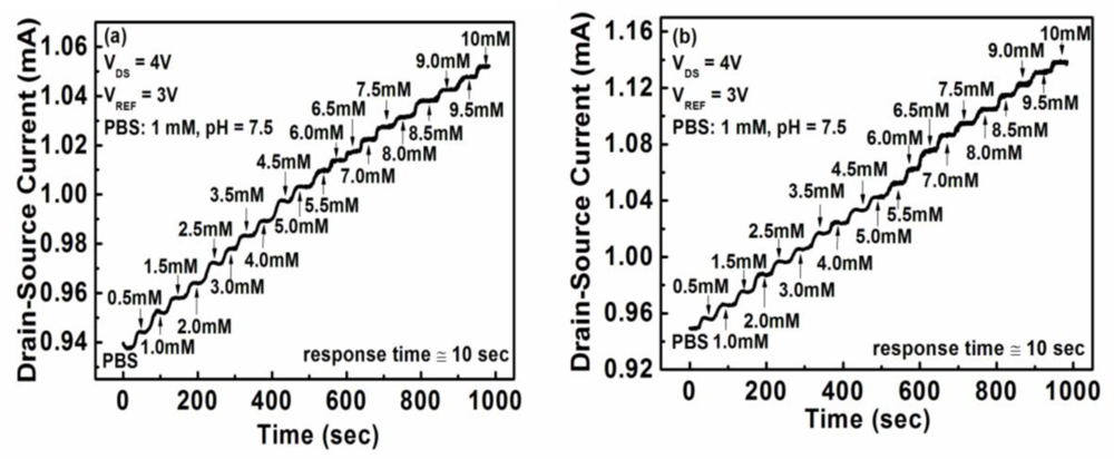 In the reaction of Equation (3), the β-d-glucose was catalyzed by the glucose oxidase to produce hydrogen peroxide and d-glucono-δ-lactone. The hydrogen peroxide was then spontaneously converted to H2O and oxygen as indicated in Equation (4). The oxygen was further reused in the reaction of glucose catalyzing. Finally, the d-glucono-δ-lactone was hydrolyzed to gluconic acid and produced hydrogen ions (H+) as shown in the reaction of Equation (5). The production of hydrogen ions reduced the pH value of the medium. Consequently, the glucose concentration could be determined by the change of pH value. To measure the sensing sensitivity and the response speed, the glucose biosensor was immersed in 1 mM phosphate buffer solution (PBS) (pH = 7.5) and the glucose concentration gradually increased in 0.5 mM steps. Figure 5(a,b) show the drain-source current response of the unpassivated and the passivated ZnO nanorod glucose biosensors operated at a drain-source voltage (VDS) of 4 V and a reference electrode voltage (VREF) of 3 V, respectively.