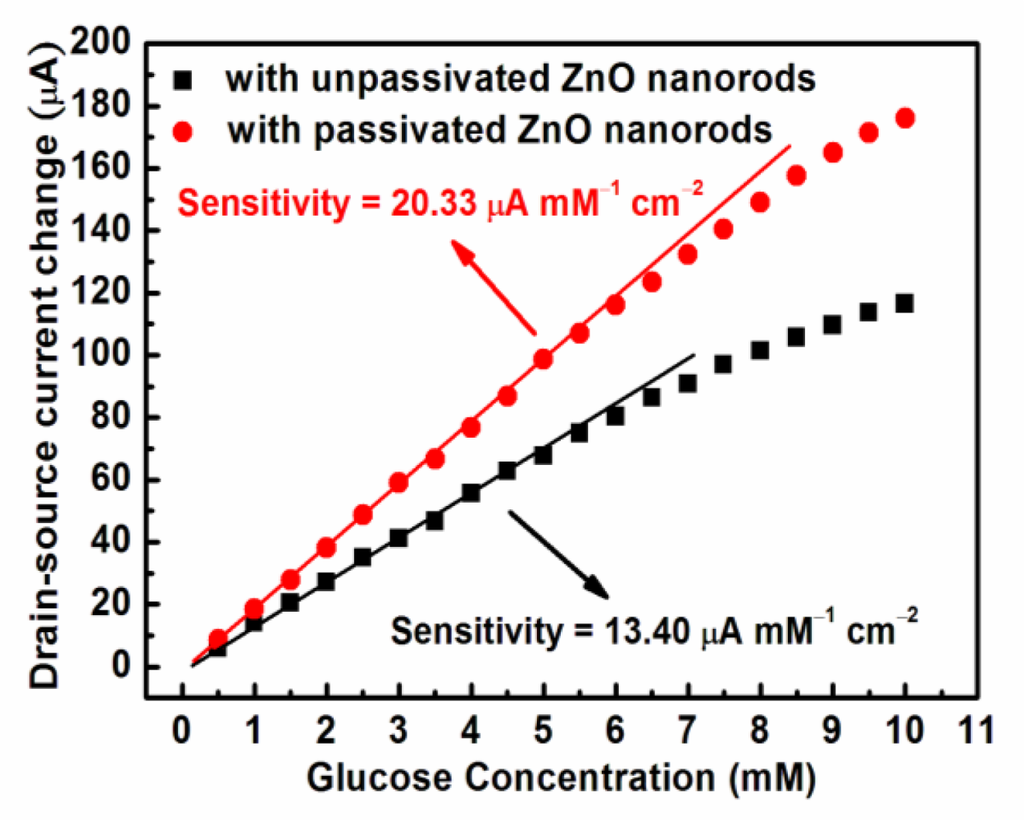 Based on the experimental results shown in Figure 5(a,b), the drain-source current change as a function of the glucose concentration is shown in Figure 6. The drain-source current change was referred the associated current measured in PBS solution. Both the unpassivated and the passivated ZnO nanorod glucose biosensors exhibited linear sensing sensitivity at a lower glucose concentration and then were prone to gradual saturation at a higher glucose concentration. The response time was about 10 s. The linear sensing sensitivity of the unpassivated and the passivated ZnO nanorod glucose biosensors was 13.4 μA mM−1 cm−2 and 20.33 μA mM−1 cm−2, respectively.