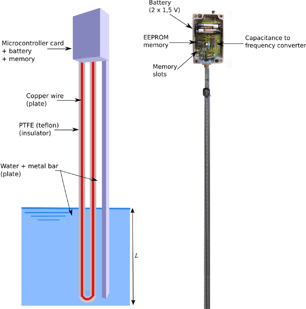 The Institute of Fluid Mechanic of Toulouse (IMFT) initiated the development of a limnimetric sensor that works as a capacitor, usually constituted by two plates and an insulator. In this study, the sensor is constituted by four main elements (Figure 1): (i) a copper wire which forms one plate of the capacitor that is wrapped in (ii) a polytetrafluoroethylene (PTFE)-insulated wire, the dielectric, which is fixed to a stainless steel rod, (iii) water that forms the other plate of the capacitor and determines the length L of the capacitor and (iv) the data logger, composed of the micro-controller card and two usual batteries (AAA 1,5 V), which is housed in a waterproof container.
