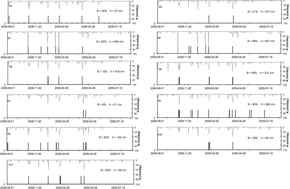 Figure 11 shows the water budget estimated on the eleven studied catchments for the hydrological year 2008–2009. The annual rainfall depths range between 352 and 548 mm showing variations in the studied spatial extent (40 km by 30 km) according a North-South gradient well known in the region. The actual evapotranspiration is clearly lower than the mean inter-annual potential evapotranspiration (1,000 to 1,500 mm). These result emphases the water stress encountered in Mediterranean regions. Catchment runoff is much less than actual evapotranspiration and highly variable from one catchment to another (near 0 for C7 and between 53 and 99 for C2). Differences between catchments are high compared to the errors made during the discharge estimation step. These differences showed that rainfall may remain inside the catchment limits (in C2 case for example) or leave these limits by surface runoff at the catchment outlet. In this late case, the water can wash off pollutants spreading on agricultural area or can be part of a problematic flooding downstream. Comparison of Figures 10 and 11 show that annual catchment runoff may be due to few flood events: at C2, the higher annual catchment runoff is explained by only four events (B has one of the lower value of 10%). However this fact cannot be generalized because we show also catchments on which runoff and B were high (C4), runoff was low and B high (C8).