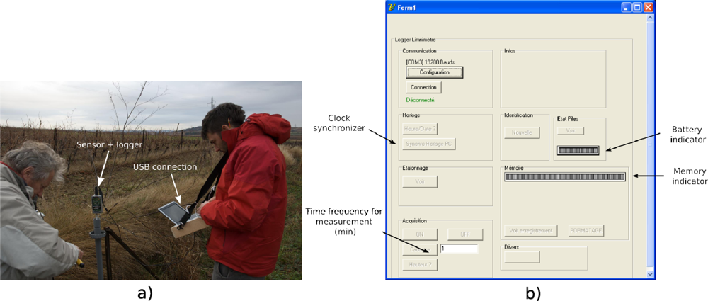 A low consumption Microchip PIC16LF628 micro-controller with firmware written in Pascal (mikroPascal) controls the data logger. To ensure a better battery life by low energy consumption, the micro controller remains in a sleep mode but automatically wakes up every 4 s for a very short time. During this short time, the clock verifies if a measurement is required: in that case, the measurement is performed and stored on EEPROM memory in the previously acquired data queue. At the same time, the micro-controller reads the binary state of a pin. When this state is 0, corresponding to a connection of the data logger to a communication wire, the micro-controller is maintained awake (in a normal mode) in order get ready to communicate with a PC.