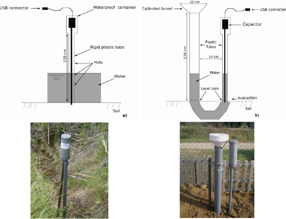 Considering these criteria, the monitoring setting was composed of a stage recorder coupled with a rain gauge using the capacitive sensor described above. Figure 3 shows the functional scheme. First, the sensor was used as a stage recorder installed in a channel. The sensor was installed into a break-through rigid plastic tube of 15 cm diameter [Figure 3(a)] in order to protect the PTFE wire from vegetative debris (leaves, piece of woods) and cobblestones that are frequently carried downstream when flow occurs in agricultural catchments. Secondly, the sensor was also used as a rain gauge [Figure 3(b)], built with a 22 cm diameter collection funnel, two connected vessels of 1 m high with the water level sensor installed in one of the two vessels. Based on the connected vessel principle, rainfall is collected through the calibrated funnel in the first tube. Water level is measured in the second vessel at an adjustable time step acquisition ranging from one minute up to few hours or days.