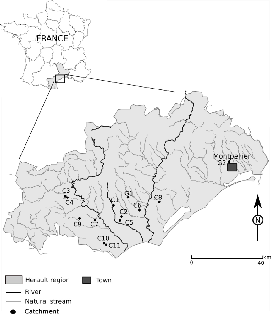 The catchments are located all over the Hérault region and were chosen to be different from each other considering their physiographic descriptors. Three pairs of catchments (C3 and C4 which are nested catchments, C2 and C5, C10 and C11) are very close from each other in order to investigate their hydrological behaviour under the same rainfall conditions.