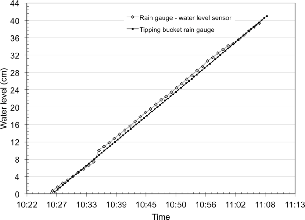 The sensor was preliminary calibrated, i.e., the linear relation between output frequencies and water levels was estimated. Secondly the sensor capacity and accuracy to measure rainfall amount and intensity was determined. A tipping bucket rain gauge was taken as the reference device. Both devices received the same rainfall event: 41 mm at a constant intensity of 11.5 mm per 10 min. Figure 5 shows the obtained cumulated rainfall amount during a test period of thirty minutes. The results highlight that the rain gauge using the capacitive sensor gives accurate results. The error on the total recorded rainfall amount is 1.60%.