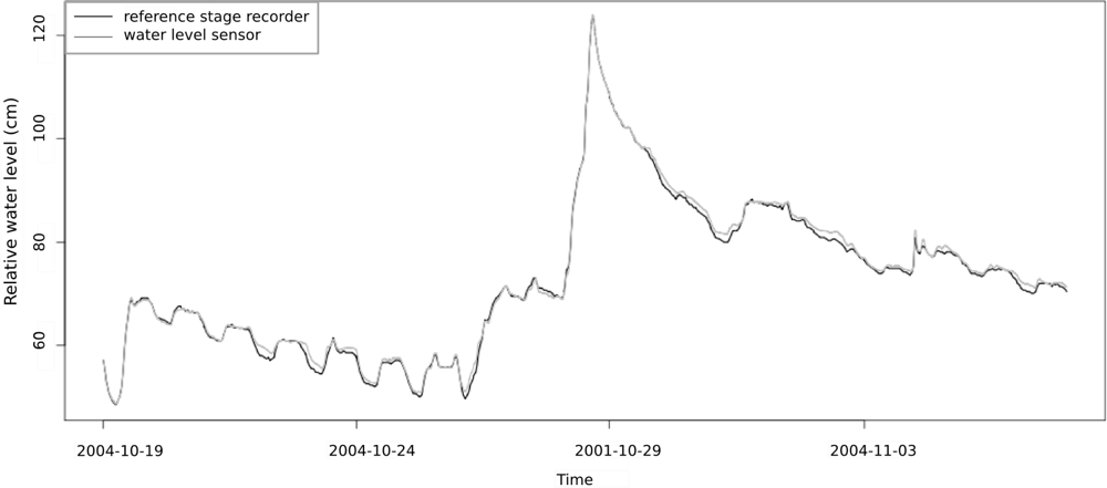 The uses of such a proposed monitoring setting are numerous: it can be built quite cheaply and consequently can be densely distributed in space; it is a nomad sensor in the sense that is easy and quick to install and uninstall in the field; due to its simple battery system, it does not need any connection to a high energy source and can be installed everywhere; due to its small size, it is a non-invasive and unnoticeable sensor which protects it from vandalism. Of course, to balance these advantages, it is expected to be less accurate than conventional sensors. The cost of the components is approximately 80 € and 100 €, respectively. The logger has a maximal temporal resolution of one minute that allows for characterizing, at a given location, rainfall-runoff events such as water level dynamics, events duration, rainfall intensity, rainfall amount (at event or annual scale) or high flow and low-flow periods. Furthermore, other variables of interest such as the water discharge could be estimated too.