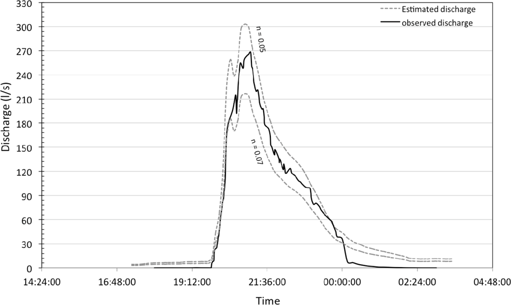 Assuming that Manning’s equation is relevant, the uncertainty in discharge estimation comes mainly from the uncertainty around n, i.e., possible values for this parameter. Indeed, vegetation is a primary factor in the increase of the roughness and resistance in channels [31,32]. Hence, a maximum value should be used during periods of low flows and high vegetation density, and minimum values during high flows and low vegetation density. Therefore, discharge estimation is associated to an envelope curve which corresponds to an upper and a lower acceptable limits on discharge estimation. Hence, when the water level sensor is installed at a catchment outlet, discharge could be estimated with a given uncertainty and several indicators could be derived to characterize catchment hydrological behaviour.