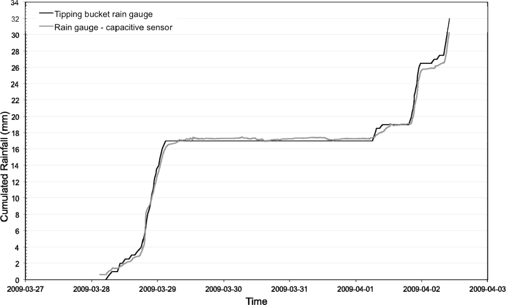 The sensor was also tested as a rain gauge by comparing cumulated rainfall amount estimated using the capacitive sensor to observations collected with the reference tipping bucket rain gauge of the INRA. Figure 9 shows the results for a 5 days period. Note the rain gauge gives accurate results over the test period: the two curves fit well, including during the period of 29/03/09 and 01/04/09 where no rainfall occurred. Moreover, the error on total rainfall amount is low, 5.40%, which represents a difference of 2 mm between observed and estimated data.