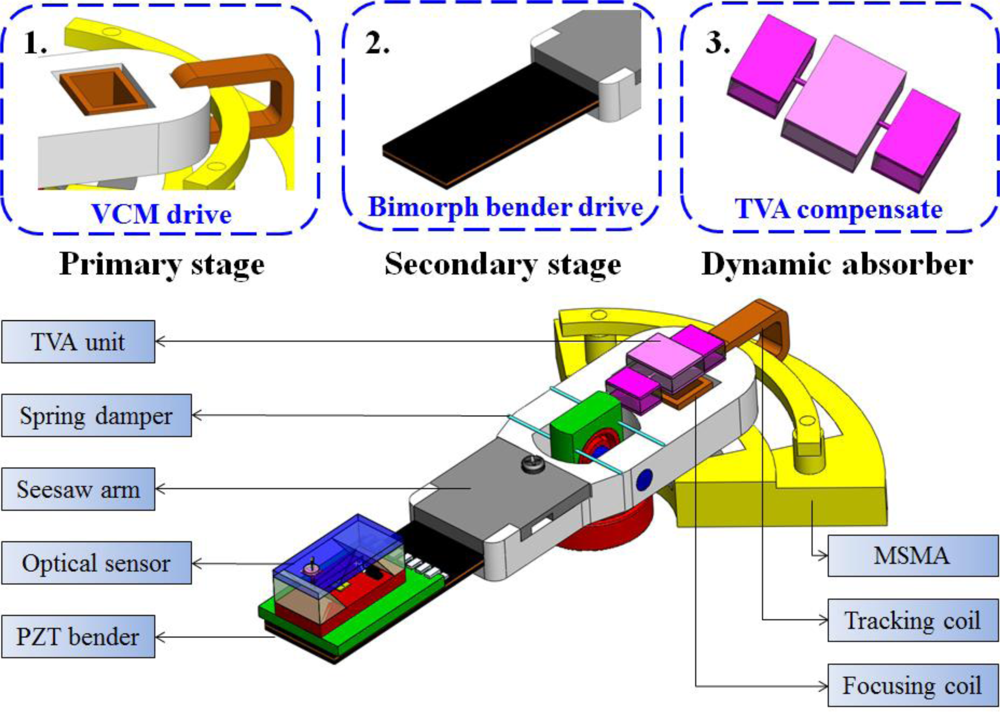 The optical axis shift during the primary VCM actuation is compensated for by using the active bimorph micro actuator. A TVA can passively absorb the residual tilt variations while actively generating a reacting force for the moment conservation. The proposed mechanism is a seesaw type swivel actuator using piezoelectric active control collaboratively with passive TVA design. The following sections describe the proposed mechanism.