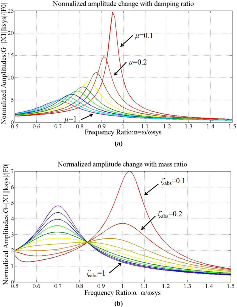 Figure 12(a) displays the relationship between μ and G. Hence, the peak is reduced with enlarged μ. According to Figure 12(b), the resonance peak frequency increases when ζabs decreases from 1 down to 0.1. The optimal damping ratio of the absorber, , is estimated as: