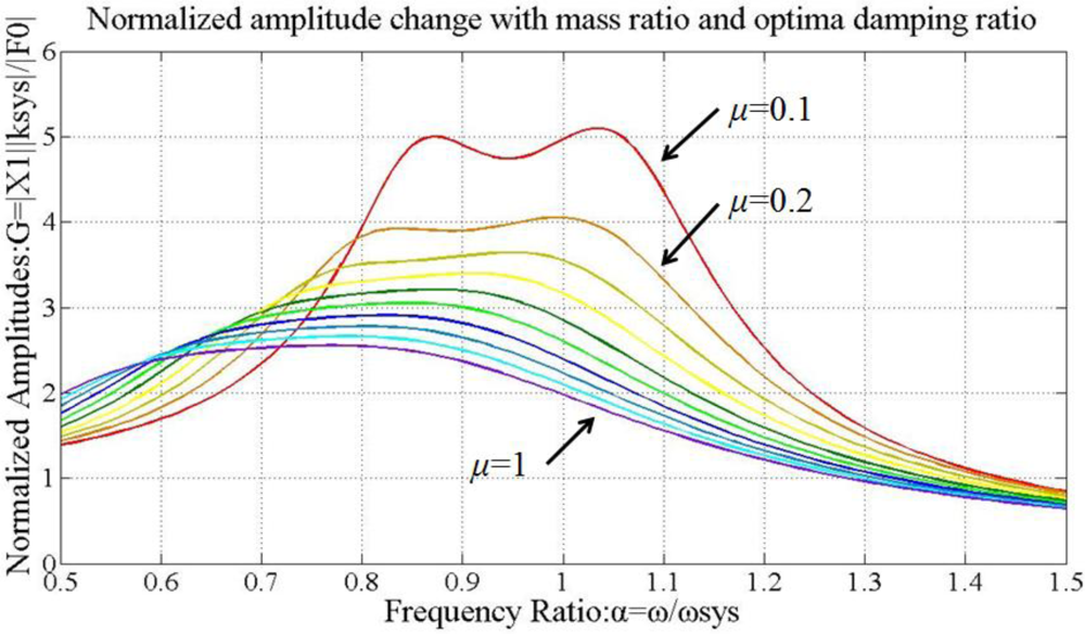 Figure 13 shows the normalized amplitude G as a function of μ. By assigning the optimal damping ratio ζabs and mass ratio μ, the vibration magnitudes are decreased effectively. (Therefore, the actual values of mass and stiffness of TVA are determined by selecting μ = 0.8 and = 0.408.