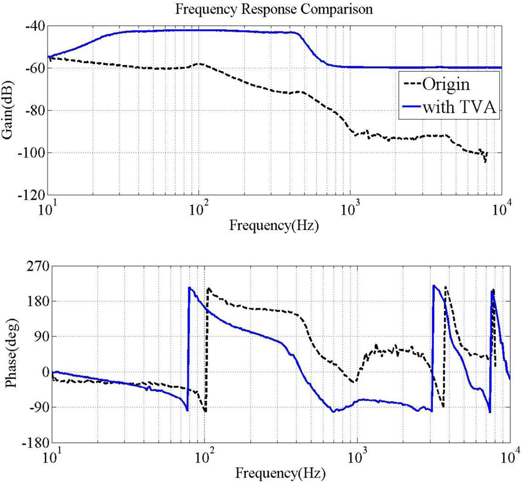 Figure 16 shows the effectiveness of TVA vibration suppression. The performance and robustness of the absorber are further enhanced by using optimal processes for dual stage actuation. According to simulation and experimental results, the passive TVA reduces the system vibration by 80% with respect to the peak amplitudes.
