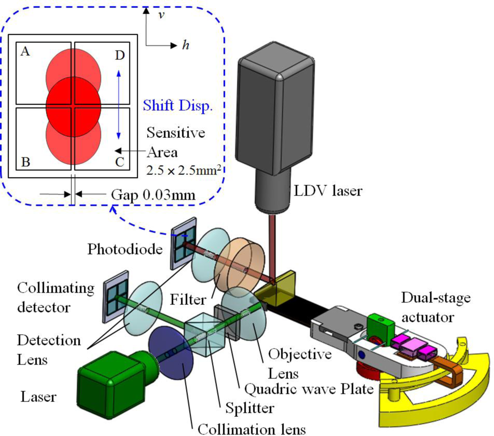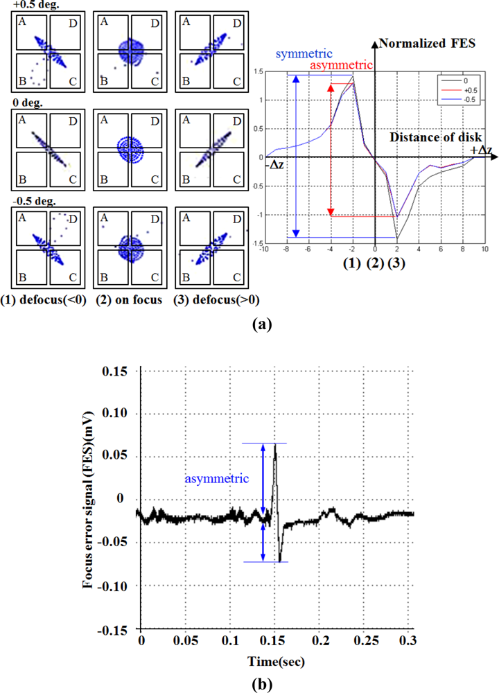 Figure 18(a) illustrates the simulated focusing error signal (S-curve) generated by the actuator tilting from −0.5○ to 0.5○, whereas the measured asymmetric S-curve is shown in Figure 18(b) for comparison. The astigmatic returning laser spot deteriorates considerably due to the tilt actuation, causing the asymmetric peak shapes of the S-curve. This unbalanced S-curve signal reduces the accuracy of optical sensing. The optical compensation for dual stage actuator is evaluated by designing the schematic layout of the reflection geometry for tilt measurement [24–26], as shown in Figure 19. The rotary angle measurement is performed by mounting a target 45° micro-prism on the precision VCM-Driven micro-positioning stage. The 635 nm wavelength laser, which is used to adjust tracking angle of dual-stage actuator, produces horizontal beam (green line) and passes through the collimating lens, the polarized beam splitter (PBS), the quarter-wave plate (QWP) to form circular polarization beam and focusing on the side of actuator by objective lens. The returning beam is reflected by the PBS and projected on the collimating detector. Furthermore, the LDV laser beam (red line, vertical) is focusing on the photo-diode to measure the dynamic tilt error motions of focus operation by varying the driving frequency in the range of 5–200 Hz. The distance of the seesaw actuator over the focus actuation stroke is 400 μm or less.