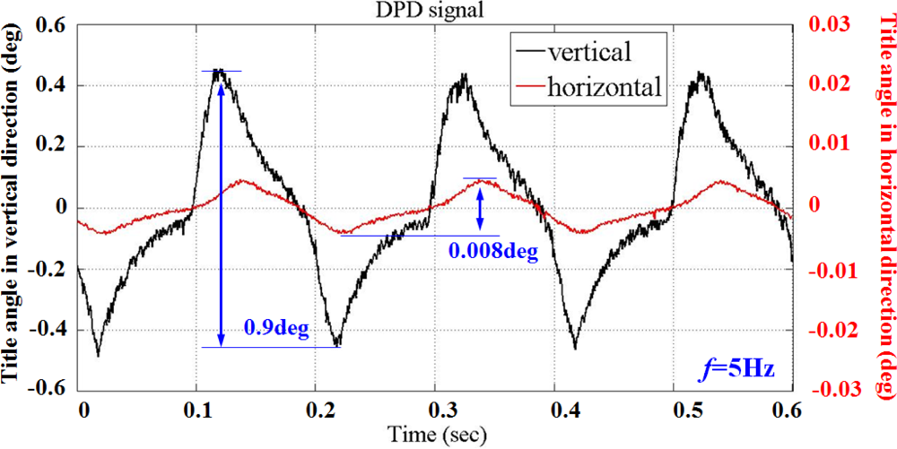 Feasibility of the proposed secondary stage PZT-actuator to compensate for the tilt actuation induced by the primary VCM actuator is demonstrated by conducting an experiment in which the dual stage actuator is kept in the in-focus condition. Figure 20 summarizes the experimental results by moving the prism with reflection geometry. The vertical (black) and horizontal (red) tilt angle are obtained based on differential phase variation with 5 Hz sine-wave excitation. Although the vertical angular displacement involves roll as well as pitch rotation, the phase variation from roll vibration is sufficiently small to be negligible compared with the actuator nutation.