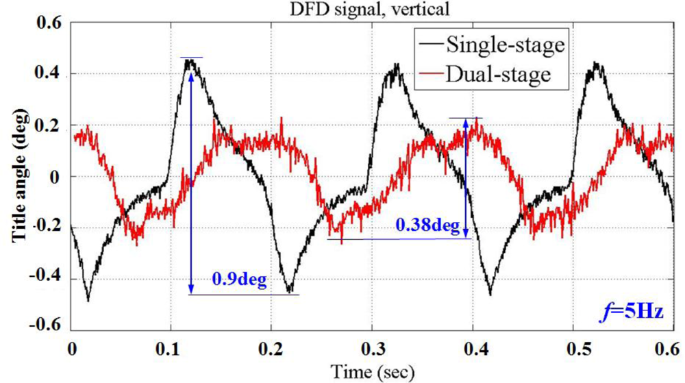 Both results closely correspond to the numerical calculations. The measurement accuracy of the photo-detector is validated. Figure 21 shows the tilt motions for both single and dual stage control. A sinusoidal signal with a frequency of 5 Hz and voltage amplitude of 6 V is applied to the seesaw actuator. As mentioned earlier, the angular displacement is within the restricted range ±0.19° (peak to peak) for the dual stage actuation than ±0.45° (peak to peak) for single-stage control. The tilt signal variance from a single-stage drive is reduced by 60% with the implementation of this dual stage compensation. Measurement results demonstrate a high stability for the application of adjusting the inclination angle of the optical axis with precision positioning, capable of satisfying the requirement for small tilt angle compensation of a dual stage actuator.