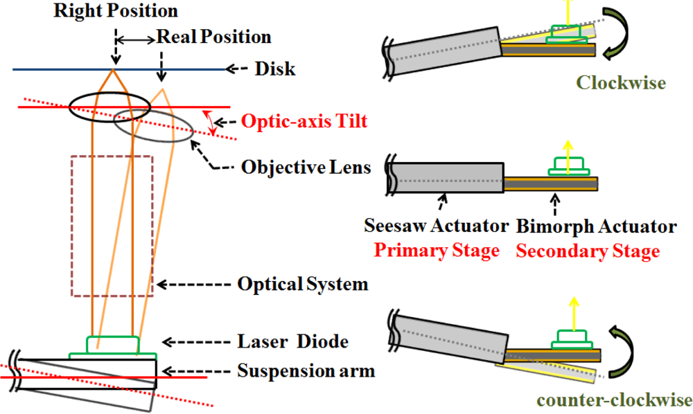A common method of piezoelectric actuated suspension is driven along the opposite data (track) tangential direction in an allowable stroke. The proposed seesaw swivel-drive actuator uses a dual-stage leverage mechanism (Figure 3), through use of a coarse movement via VCM control and a secondary fine positioning via PZT. As PZT compensates the tilt angle of seesaw arm in the opposite way—the laser beam will be kept in orthogonal to the disk (Figure 3, left). Hence, PZT tilt control fixes the tangential displacement of focusing, and calibrates the asymmetry of the S-curve. Complete two-axis scanning is then performed by independently controlling the dual stage actuators.