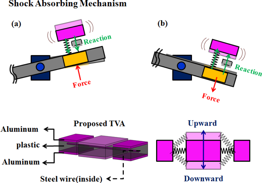 Two possible actuated mechanisms are available for active and passive head-positioning control. For active actuation, Yeack-Scranton devised a secondary stage PZT bender with an active slider for contact recording [5]. Following the PZT actuator and its applications, Tagawa proposed a self-loading slider featuring a twin structure piezo-actuator to maintain constant flying height spacing [6]. Kajitani developed an active slider associated with multilayered piezo-actuators to compensate for flying height variation [7]. In contrast with the above track-seek operations, Jun and Takashi investigated the feasibility of using a circular arc slider driven by a piezoelectric actuator to reduce the tilt motions of the lens in pitching/rolling directions [8]. Liu investigated the feasibility of a dynamic motion approach for a piezotube actuator subjected to disk deformation [9]. Moreover, in study involving a multilayered structure, Woosung used a flexure hinge mechanism to extend the allowable stroke to tracking and focusing motions [10]. Additionally, passive mass absorber utilizes an inertial mass and tuned support to mitigate mechanical vibration. Chung introduced a two-dimensional vibration model of a feeding deck system to reduce in-plane vibration [11]. According to their functional and structural identification, Heo characterized the dynamic behavior of a passive damper consisting of a rubber bobbin and plate ring [12]. Moreover, Chung established a design procedure to combine passive and active devices with an enlarged bandwidth control. That adaptive dynamic absorber is embedded with a voice coil motor (VCM) device [13]. However, to make use of the hollow space within the VCM, Jiang investigated the feasibility of a tuned dual mass damping device [14]. In particular, Kuwajima developed a novel shockproof structure by using a balanced type suspension, as well as investigated its performance on external shock resistance during read/write operations [15].