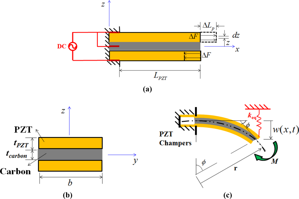 Figure 5 displays a “sandwich”-like PZT that consists of a carbon fiber chip with two d31-type PZT ceramics. This figure also considers a small piece element in the upper PZT material, in which the corresponding extension can be evaluated as follows:
