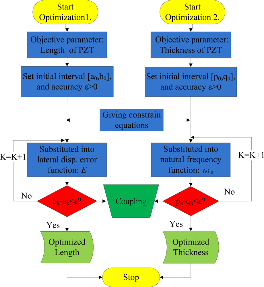 Figure 7 illustrates the optimization procedure, indicating that the PZT bender is optimized. Of the two coupling optimization processes, optimization 1 determines objective functions and sets the initial search interval and accuracy. Meanwhile, optimization 2 copes with constraint conditions for the process. The optimization of length LPZT and thickness tPZT, which minimize objective functions to PZT, are 14.13 mm and 0.11 mm after 64 and 59 iterations, respectively.
