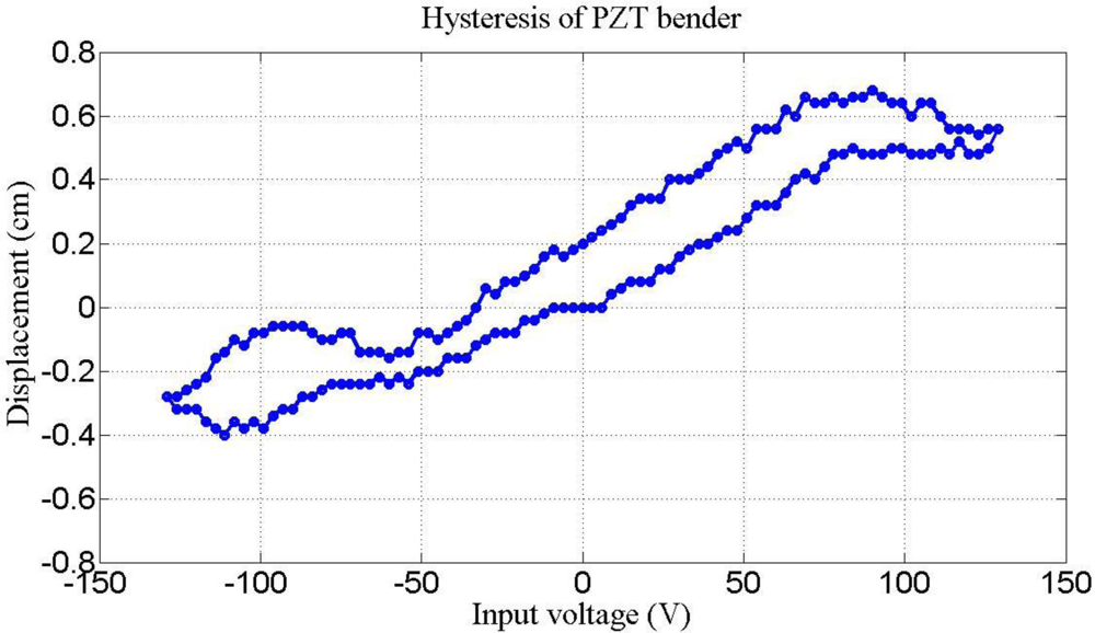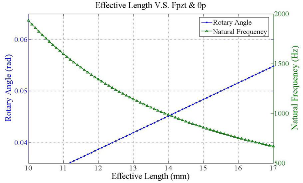 Figure 8 plots two parameters, rotary angle ϕ [Equation (7)] and fundamental frequency ω1 [Equation (15)] as a function of effective length. The crossover point is selected to verify the optimization results. Figure 9 illustrates the hysteresis curve of PZT displacement with maximum point is 4 mm when input a sine wave signal is swept from −125 to 125 V. Finally, the experimental results in Figure 10 demonstrate two modes frequency at 985 Hz and 5.8 kHz. Table 2 summarizes the modal analysis results between the numerical optimization and experiments, in which the errors vary by about 1.86% and 3.14%, respectively.