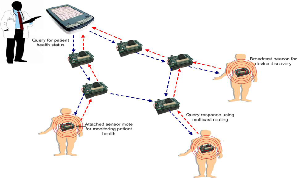 In Figure 1, each patient is equipped with a sensor mote that is used to monitor health status. A simple device discovery protocol is employed so that the motes in the network can discover each other. Specifically, each node periodically publishes its node ID and the sensor types it supports to a specific broadcast channel using a broadcast beacon. End-user devices, such as personal data assistant (PDA) devices operated by medical professionals (e.g., doctors or nurses), issue network wide queries to request information of patients that are monitored by a group of sensor motes that possess specific biomedical sensing capabilities. In order to facilitate a query and response communication process, the TinyADMR multicast routing protocol is used to establish multicast routes between the data publishing sensors and the end-user devices that subscribe interest to that data. The main purpose of TinyADMR is to deliver queries and responses under the effect of node mobility, multiple simultaneous paths, and an error-prone communication channel. For the querying mechanism, an interface is designed to allow a receiving device to request data from specific biomedical sensors based on their physical node address, sensor type, and whether or not it meets the requirements of a specified filter. CodeBlue is also equipped with a RF-based localization system that is used to track the location of patients and caregivers, a capability that is especially valuable in large hospital settings.