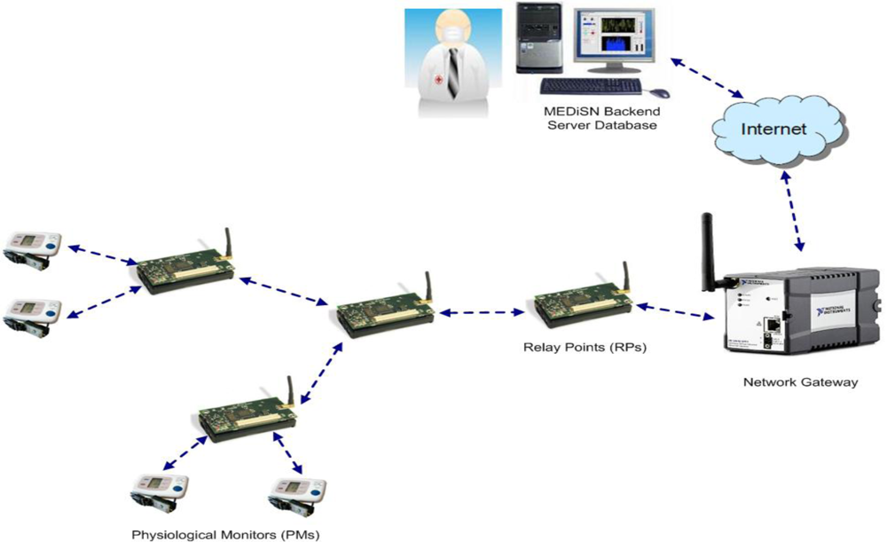 MEDiSN [19]: The Medical Emergency Detection in Sensor Networks (MEDiSN) project utilizes a wireless sensor network composed of a network gateway, physiological monitors (PMs), and relay points (RPs), to monitor the health and transmit physiological data of patients. Figure 2 provides an illustrative overview of the MEDiSN architecture and how the various components (e.g., PMs, RPs, etc.) operate. The PMs are sensor devices which collect, encrypt and sign patients’ physiological data (e.g., blood oxygen level, pulse, ECG, etc.) before transmitting them to a network of relay points that eventually forwards the data to the network gateway. The RPs self organize into a routing tree that facilitates the reliable delivery of periodic data and alerts from the PM to the network gateway, and also from the network gateway to individual PMs. The data received by the network gateway is stored persistently at a backend server, where clients can use a graphical user interface (GUI) to access the data through different queries. Unlike CodeBlue in which the PMs generate and forward data, only the RPs in MEDiSN are responsible for relaying data (i.e., PMs in MEDiSN only generate data and are not involved with data forwarding). As a result, the RPs can use hop-by-hop retransmissions to assure the reliable delivery of bidirectional data traffic that is prone to packet collision and corruption. The designations of RPs as the sole nodes with forwarding capabilities allow PMs to duty cycle their radios and reduce their energy consumption. On the other hand, RPs cannot duty cycle because they are actively forwarding packets. However, due to the static nature of the RPs, they can utilize the regular power supply from the hospital or use batteries in scenarios with no infrastructure. Another feature that MEDiSN offers is an over-the-air management interface that remotely controls individual PMs using downstream messaging.