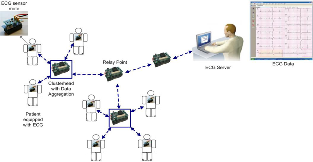 MASN [20]: the robust Medical Ad hoc Sensor Network (MASN) is a practical hardware and software platform designed to perform real-time collection of health care data. MASN adopts a reliable cluster-based communication scheme as its routing protocol for transmitting data. The protocol groups wireless sensor nodes in clusters to detect signals for the purpose of prolonging the lifetime of MASN, load balancing, and scalability. The clustering scheme reliably relays collected ECG data to the ECG server (sink) in the form of aggregated packets. As a result, it is able to provide fast and accurate event detection and reliability control capabilities to the area where the event is occurring because the overhead, latency, and packet loss are reduced. Figure 3 provides an overview of the MASN architecture and the operation of the different components. As previously mentioned, groups of patients equipped with ECG sensors are organized into clusters. In these clusters, a clusterhead is elected and used as an aggregation point to relay data to the ECG server. After the data is collected, wavelet-based ECG feature extraction and classification techniques are applied to the patient data and characteristic points of interest are extracted. The main benefit of the ECG data mining mechanism is that it provides meaningful information for the diagnosis of possible cardiovascular diseases and also automates the extended recordings of ECG signals, instead of using human processing that is very time consuming and may lead to human errors. To secure the wireless transmission of vital patient data, MASN also employs a low overhead and low complexity encryption and decryption security scheme. The security scheme periodically issues session keys (SK) to cluster heads for secure transmission of data between clusters. Therefore, the security scheme must secure against possible gateway attacks (SKs are issued by the gateway), SK attacks among cluster heads, patient ECG data corruption, and man-in-the-middle attacks [20]. The security scheme successfully defends against these attacks, but does so by adding up to 20% overhead to data packet transmissions [20]. MASN also features a patient location tracking system that is an enhanced version of the CodeBlue MoteTrack [13] algorithm. Using only radio signal information, MoteTrack can determine the location of a patient with an accuracy of 1 meter. The enhanced version of MoteTrack does not use GPS. Rather, the RF chip on each MASN sensor node broadcasts beacon messages at a range of different transmission power levels that the MoteTrack algorithm uses to perform location estimation of patients’ positions.