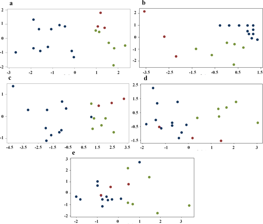 The five “reduced” datasets were then explored and graphically expressed by the correlation-matrix PCA. The corresponding score plot of the two principal components are presented in Figure 2 for each of the five datasets.