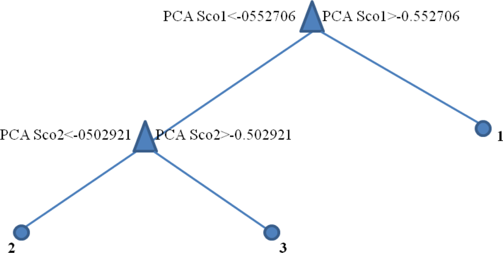 For each of the five datasets, the subset of variables selected from the 165 original variables via the CART method was subsequently adopted as input data for the matrix-correlation principal component analysis (PCA). This technique transforms the entire set of n-correlated variables to n-uncorrelated linear functions of the original measurements. The first principal component is the linear combination of all variables showing the maximum variation among the samples. The second, third and further components are similarly linear combinations representing the next-largest variations, irrespective of those represented by the previous combination. In the literature, orthogonal transformations such as PCA have been utilized to mitigate possible negative effects of a feature-selection process (as in the case of CART model), such as the correlation among variables of datasets [26].