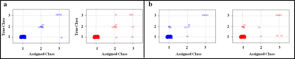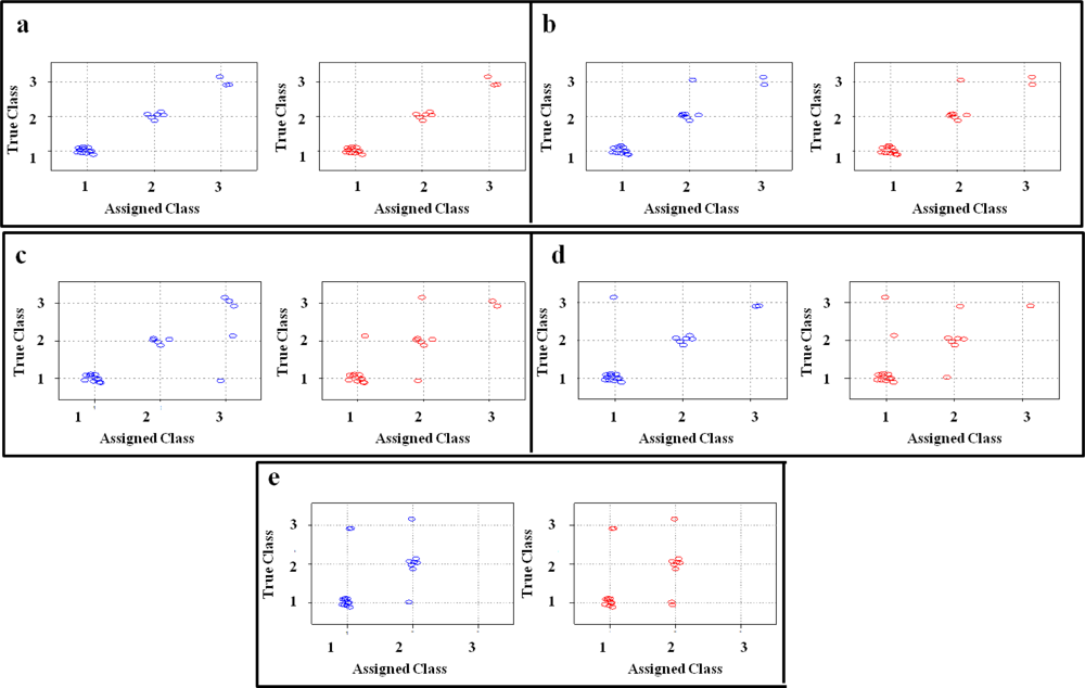 Graphical representations of CART classification performances were also possible. Performance plots for each analytical protocol are presented in Figure 4. Classes assigned by the model are represented on the X-axis, whereas the true classes are represented on the Y-axis. The group of non-contaminated samples is on the left-bottom part of each plot; samples below the legal limit are on the central part of the plots; and samples above the legal limit are on upper-right part of the plots. In Table 4, the performances of the models in both fitting and prediction are summarised.