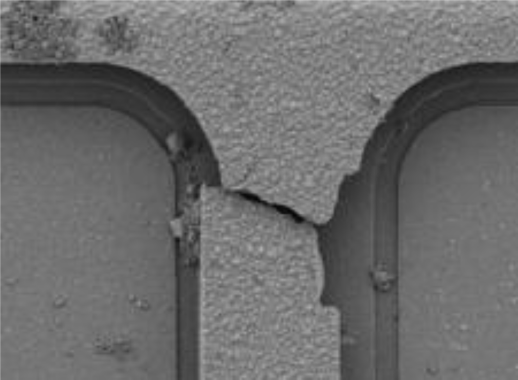 Relevant shock-induced mechanical failures were investigated in [14], where fracture of the suspension springs of a MEMS accelerometer was studied (see Figure 1). In this case failure occurred close to the anchor; such kinds of failure are directly related to the sensor layout, which leads to stress intensification in that region because of the re-entrant corners at the spring-anchor joint. Very similar failure mechanisms were observed in [18,20]; in Figure 2 the typical failure mechanism experienced by a MEMS subjected to laboratory drop tests is depicted, once again showing crack patterns close to the spring-anchor (or spring-plate) joint.