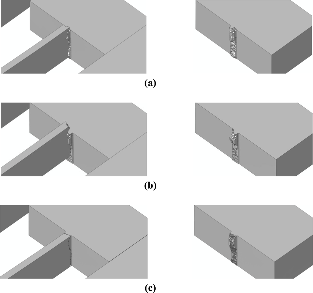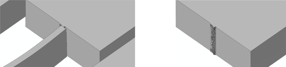 All these outcomes testify that the location of crack initiation does not depend on the adopted mesh, being determined by the loading conditions only. On the other hand, mesh refinement allows one to obtain a better description of the crack path, till percolation: crack faces appear smoother and smoother by decreasing de. As far as the characteristic times of failure are concerned, crack inception respectively occurs 1.16 μs and 1.77 μs after the impact in the bottom and top drops. The whole crack event due to the bottom drop, up to percolation, takes place in 0.13–0.14 μs, independently of the mesh. Crack percolation due to the top drop instead occurs within 0.05 μs, 0.11 μs and 0.13 μs in the simulations featuring de = 200 nm, de = 150 nm and de = 100 nm; hence, time to failure tends to converge toward an (almost) element size-independent value upon mesh refinement.